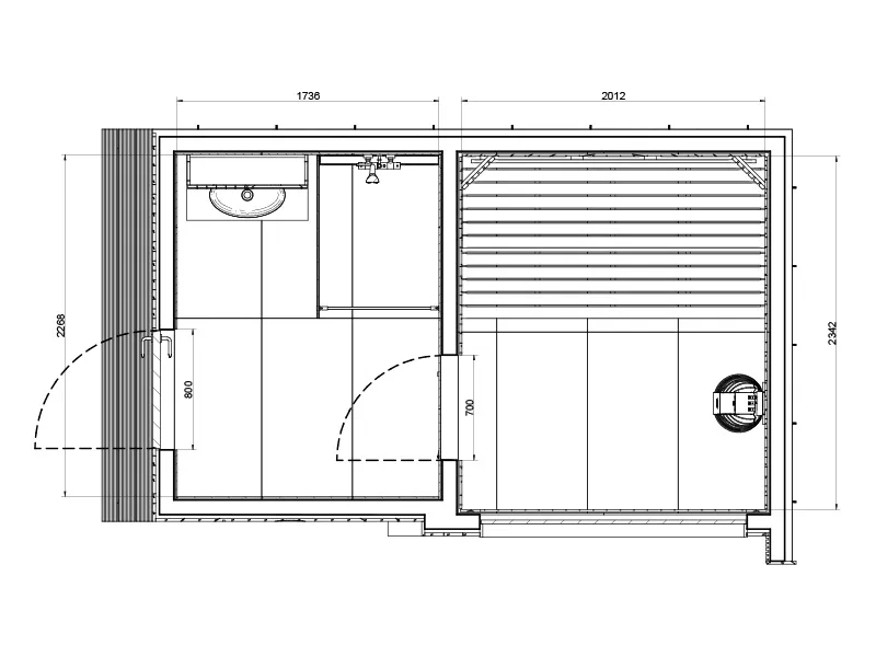 This layout enables a natural transition between heating, cooling, and relaxation stages—essential for authentic sauna rituals. The convenience of having a shower and basin within the same structure allows users to maintain the wellness cycle without leaving the building.